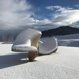 Andi Rieser arbeitet mit einem besonders wertvollen Material. Seine Objekte sind alle in Bronze gegossen. Dabei sind seine Objekte in ihrer Art sehr unterschiedlich. Eines seiner berühmtesten Werke ist das in Bronze gegossene Boot. Die Struktur in Kombination mit der Halterung erweckt den Eindruck einer Spiegelung des Objekts durch die Wasseroberfläche.