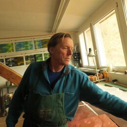 Peter Ruegger malt mit Acrylfarben und kombiniert diese mit Collagen oder Zuschlagstoffen wie Bitumen, Holzkohle, Asche, Sand, Gips oder Modeliermasse. Seit 2002 präsentiert Peter seine Bilder an diversen Ausstellungen.