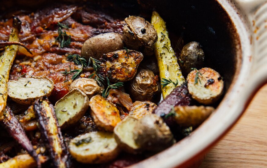 Ein saftiger Rinderbraten, langsam geschmort mit reichlich Thymian und Knoblauch, wird zart und aromatisch. Die Kräuter verleihen dem Fleisch ein intensives Aroma und machen es perfekt für ein gemütliches Sonntagsessen.