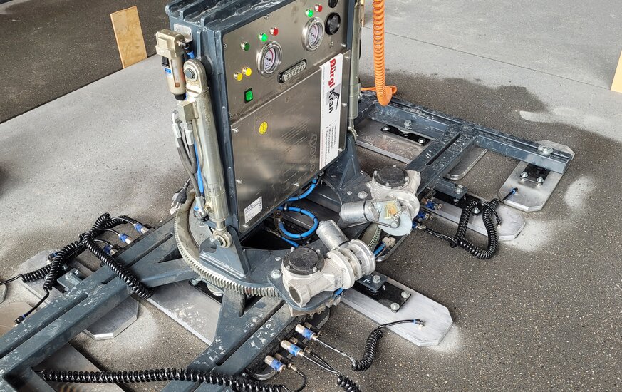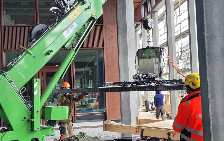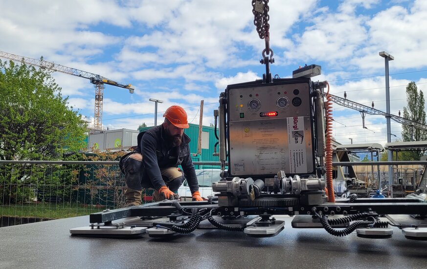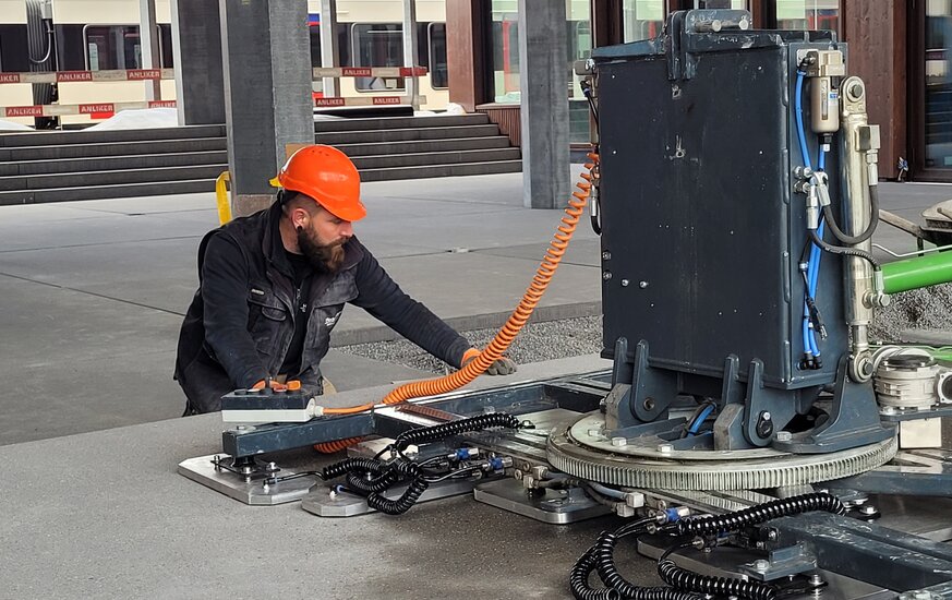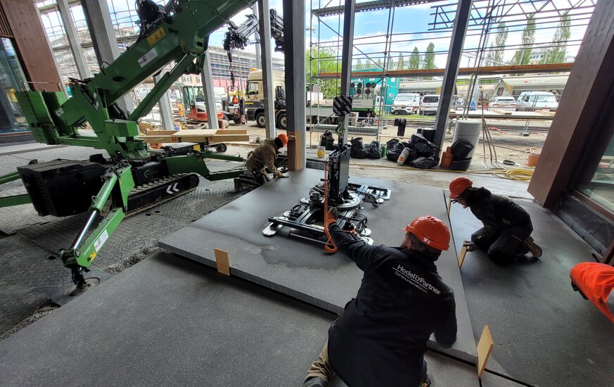 Das Rööslimattquartier in Luzern ist bereits weit fortgeschritten und wird bereits Ende 2024 in Betrieb genommen. Im Bereich der Gleisslogia und Arkade verlegen wir derezti bis zu 2.04 Tonnen schwere Betonplatten. Die Platten mit einer Grösse von bis zu 3 x 3 Meter sind eine Herausforderung nicht nur aufgrund des Gewichts. Mit einer Breite von bis zu 3 Meter sind die Betonelemente zu gross um zwischen den Säulen der Arkade hindurch gekrant zu werden. Die Platten müssen also mit einem speziellen Kranaufsatz um 90 Grad gedreht werden. Möglich macht dies ein Vakuumgerät mit einem drehbaren Kopf. Der LKW Kran navigiert die Betonplatten also mit Hilfe des Vakuumgerätes durch die Säulen. Dort übernimmt dann ein kleinerer, mobiler Kran damit die Platten exakt verlegt werden können.