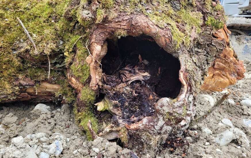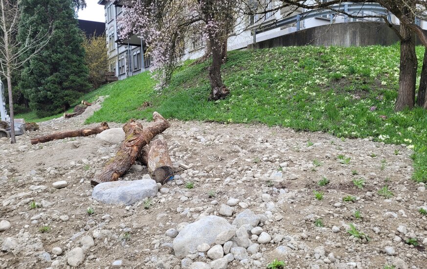 Entstanden ist ein vielfältiger Bereich mit grossen Totholzelementen, Sandflächen für Wildbienen und einheimischen Pflanzenarten. Die Baumstämme bieten nicht nur wertvollen Lebensraum für Insekten und Kleintiere, sondern tragen auch zur ökologischen Vielfalt bei. Die gezielt eingesetzten Sandinseln schaffen ideale Bedingungen für bodennistende Wildbienen, deren Bestände stark zurückgegangen sind.