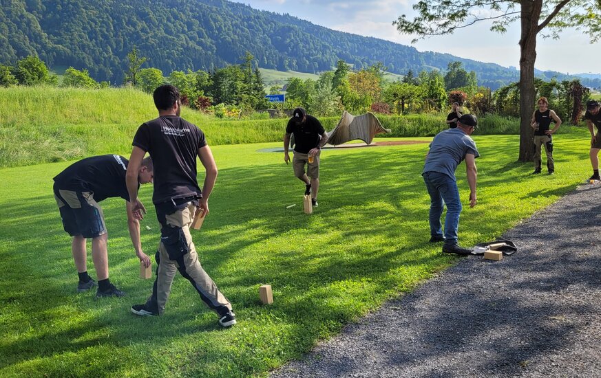 Der Nachmittag startete mit einem gemütlichen Mittagessen bei uns im Gartenpark. Gestärkt vom feinen Essen und mit guter Laune ging es dann weiter zu den einzelnen Posten bei welchen jeweils einer der fünf Führungsgrundsätzen von Hodel & Partner vorgestellt wurde. Hierzu wurden fünf Teams gebildet welche aus bunt durchmischten Kollegen bestand. An den einzelnen Posten wurde dann jeweils innerhalb der Gruppe diskutiert, wie sich der Führungsgrundsatz im Alltag umsetzen lässt und welches die Herausforderunge sind.