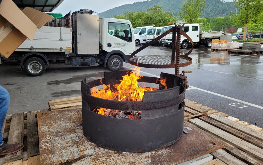 Um 14.30 Uhr sah es an diesem Freitag noch nicht nach einem gemütlichen Grillabend aus. Es regnete in Strömen und niemand hatte damit gerechnet, dass an diesem Tag noch ein Sonnenstrahl durch die dichte Wolkendecke schimmern würde. Um 15 Uhr versammelten sich dann alle Teammitglieder im Werkhof und es wurde über das vergangene sowie das laufende Jahr informiert. Im Anschluss folgte die grosse Überraschung. Hinter einem grossen schwarzem Vorhang fuhr unser Maschinist David Brand stolz mit dem neusten Zuwachs unseres Maschinenparks hervor. Einem Schreitbagger Kaiser S8 Allrad von der Firma Kaiser AG. Perfekt ausgestattet mit Tiltrotator, Greifer, sowie einem Plattenvibrator der Firma Gebrüder Egli Maschinen AG wird der Schreitbagger uns zukünftig bei