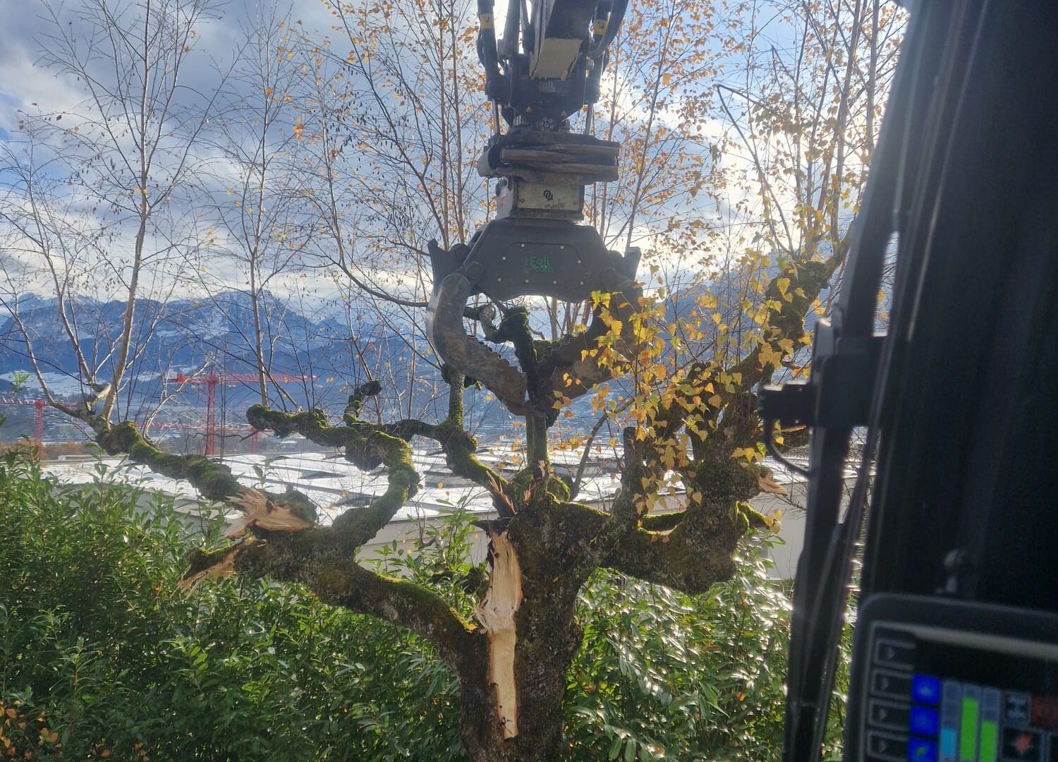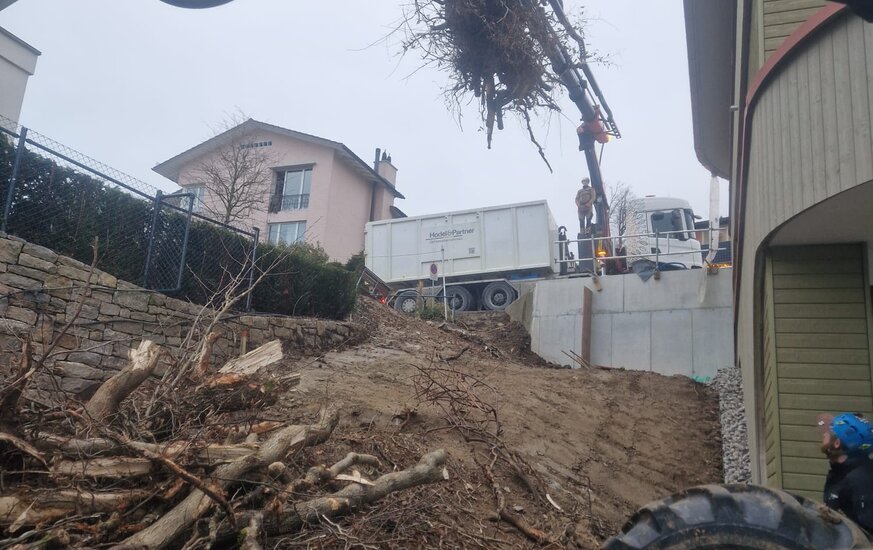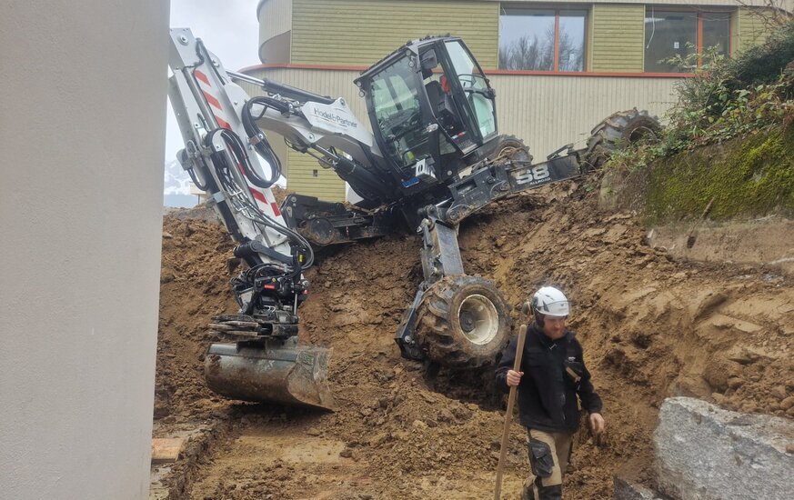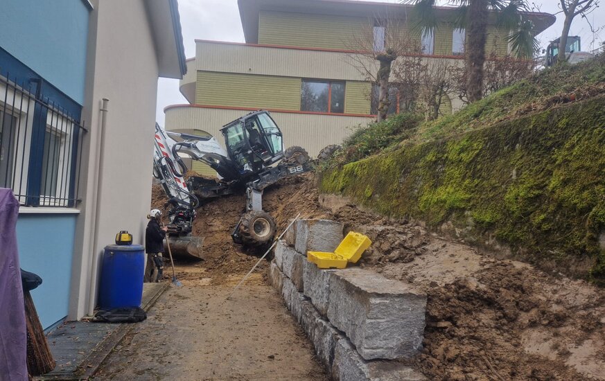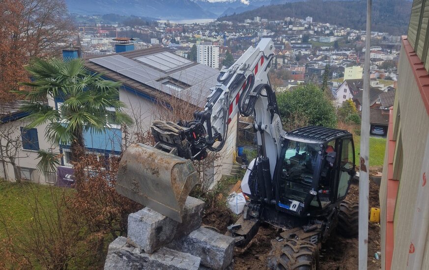 Die Arbeiten rund um das Einfamilienhaus auf dem Sonnenberg waren aufgrund der Hanglage mit einem Rauppenbagger nicht ausführbar. Für den Schreitbagger und sein erfahrener Pilot jedoch absolut kein Problem.