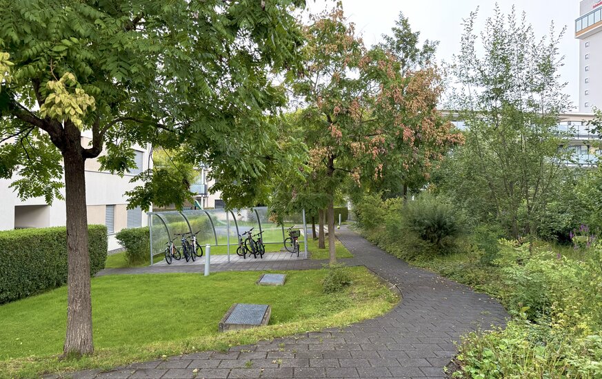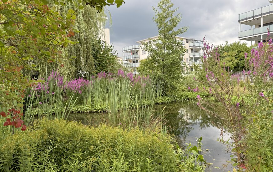 Zentrales Element der Anlage ist ein offengeführter Bachlauf, der in einen naturnah gestalteten Teich mündet. Dieses Gewässer bildet ein ökologisches Rückgrat und bietet zahlreichen Pflanzen- und Tierarten wertvollen Lebensraum, unter anderem wird die Anlage gelegentlich sogar von einem Biber besucht. Die gezielte Pflanzung von standortgerechten Bäumen und Sträuchern schafft strukturreiche, schattige Aufenthaltsbereiche mit hoher Aufenthaltsqualität für die Bewohnenden.