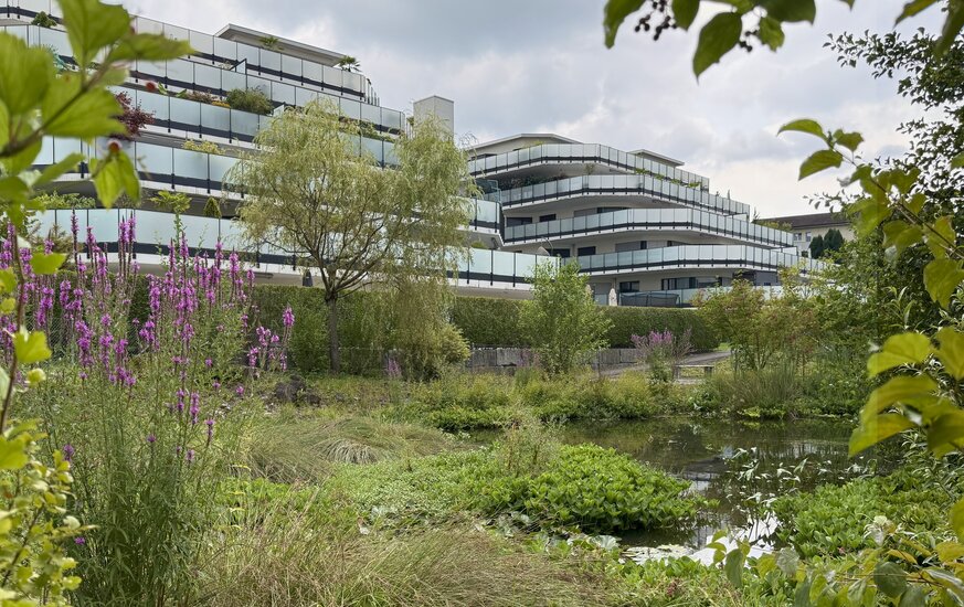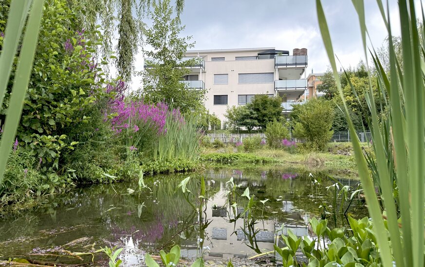 Diese Wohnüberbauung zeigt exemplarisch, wie naturnahe Gestaltung und moderne Siedlungsentwicklung miteinander harmonieren können. Anstelle einer konventionellen Grünflächengestaltung mit Rasen und Hecken wurde hier ein vielfältiger Lebens- und Erholungsraum geschaffen, der Mensch und Natur gleichermassen zugutekommt.